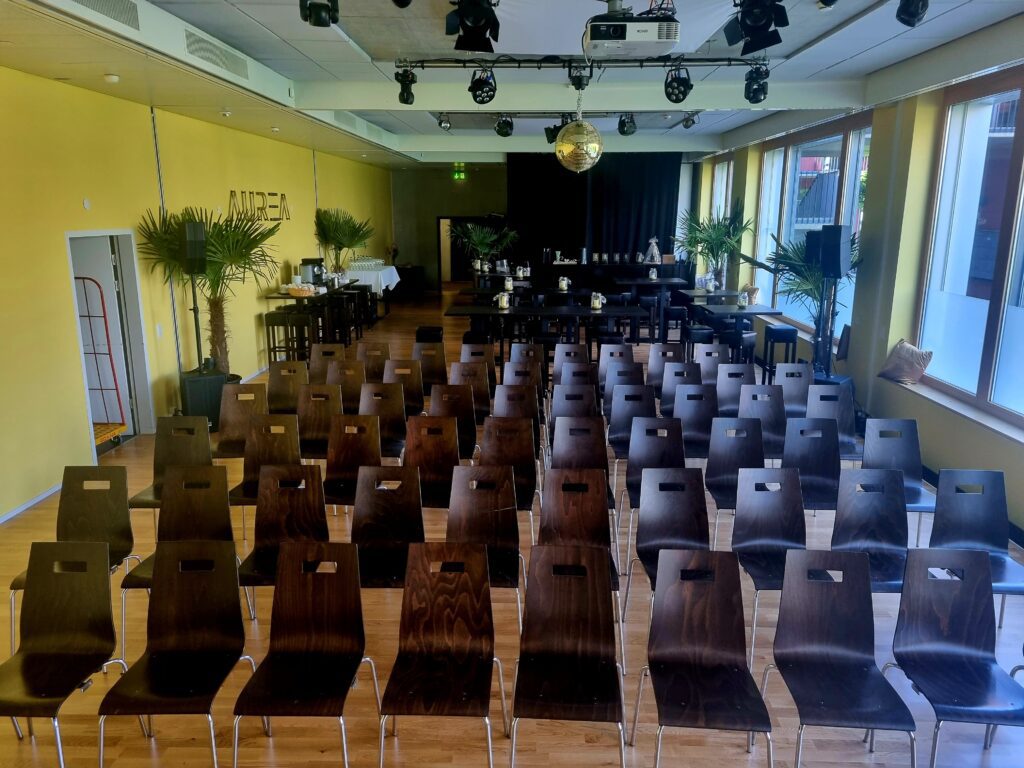 Auf knapp 200m² finden Sie im AUREA Platz für Ihr Meeting, Workshop, Seminar oder Firmenevent. Je nach Bestuhlungsform sind Seminare bis maximal 100 Personen möglich. Dafür wählen Sie aus verschiedenen Bestuhlungsformen, die passende Bestuhlung für Ihr Event aus. Auch ein Mix aus Seminar- und Eventbestuhlung ist möglich. Zusätzlich steht im Eventraum eine Bar, sowie Licht- und Eventtechnik und eine regulierbare Lüftung / Klima für Sie bereit.